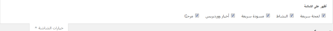 خيارات الشاشة Screen Options تتيح لك اختيار اى الاقسام المصغرة widgets تود اظهاره فقط من خلال تحديد/الغاء التحديد بجوار اي قسم.ويمكنك اظهار خيارات الشاشة باضغط عليها فقط وتوجد اعلى يسار الصفحة.