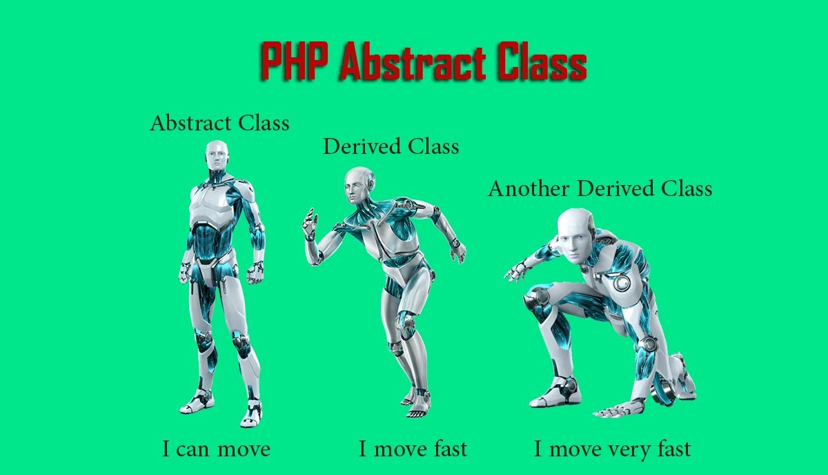 <?php abstract class robot{ public $hands; public $legs; public $head; public $eye; public $color; public function walk(){ echo "I can walk"; } public function run(){ echo "I can run"; } public function set(){ echo "I can set"; } public function stand(){ echo "I can stand"; } public function moveRight(){ echo "I can move right"; } public function moveLeft(){ echo "I can move left"; } public function backward(){ echo "I can move backward"; } public function forward(){ echo "I can move forward"; } public abstract function speed(); } class homeRobot extends robot{ public function speed(){ return "I'm a home robot and i move slowly"; } } class factoryRobot extends robot{ public function speed(){ return "I'm a factory robot and i move fast"; } } class warRobot extends robot{ public function speed(){ return "I'm a war robot and i move very fast"; } } $homerobot= new homeRobot(); echo $homerobot->speed().'<br>'; $factoryrobot= new factoryRobot(); echo $factoryrobot->speed().'<br>'; $warrobot= new warRobot(); echo $warrobot->speed(); ?>لاحظ تم تعريف جميع الخصائص والطرق المشتركة بشكل طبيعي، أما عند تعريف الطريقة التي ستحدد سرعة كل فئة بشكل مختلف حسب نوعها ، تم تعريفها بشكل مجرد في السطر رقم 32 وهي ()speed. ثم بعد ذلك قمنا بتوريث الفئة المجردة robot مع تحديد السلوك المخصص لكل فئة حسب نوعها مثل ما حدث في الاسطر 36 ، 41 و 46.