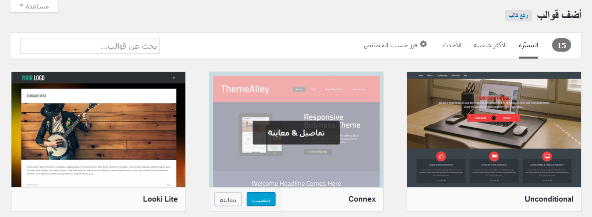 من خلال منصب القالب التلقائى Automated Theme Installer يمكنك اضافة قالب من عدة قوالب مقترحة من خلال ووردبيس وجميعها مجانية.يتم تقسيمها الى قوالب “مميزة” Featured , “الأكثر شعبية” Popular , “الأحدث” Latest, “فرز حسب الخصائص” Feature Filter حيث يمكنك البحث أو تصفية القوالب تبعا لخصائص معينة.