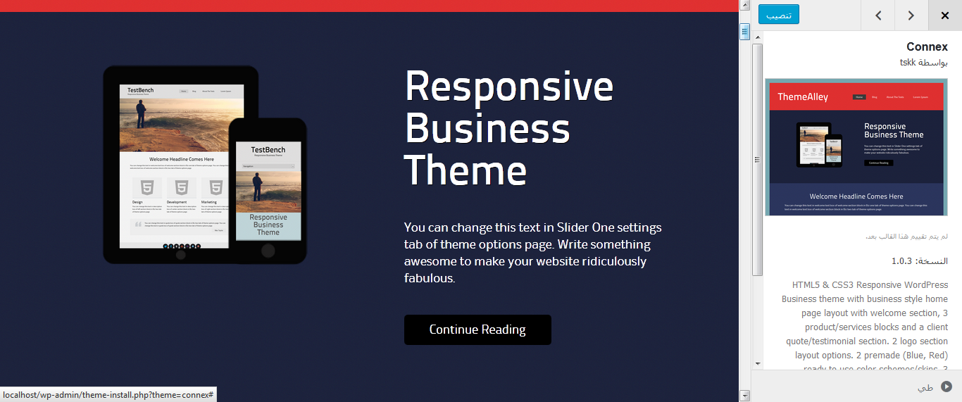 تفعيل قالبلتفعيل قالب معين يمكنك الوقوف بالماوس على القالب المرغوب فيه كما ترى فى الصورة السابقة. حيث يظهر ثلاث خيارات وهى “تفعيل” Activate وبالنقر عليها يتم تفعيل القالب اما الخيار الاخر وهو “معاينة حية” Live Preview لمشاهدة شكل القالب قبل التفعيل و “تفاصيل القالب” Theme Details لقراءة بعض امكانيات القالب.