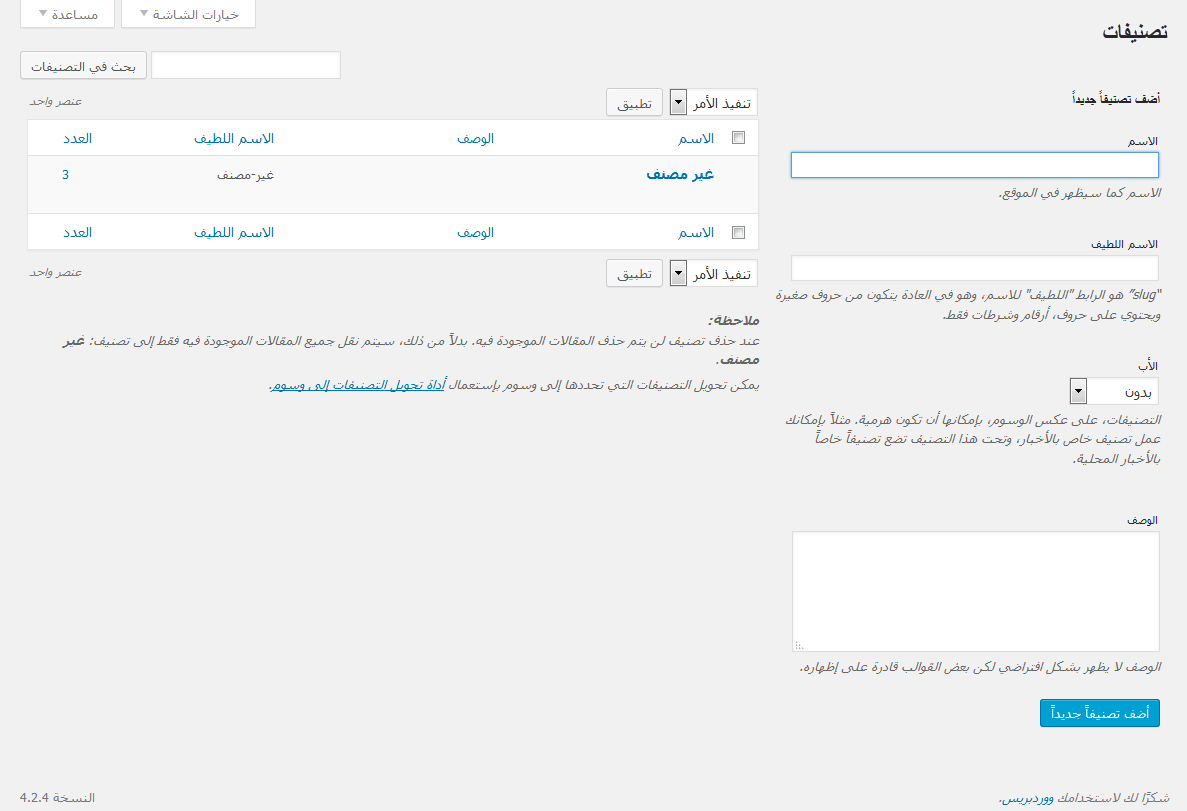 صفحة ادارة التصنيفاتمن خلال صفحة ادارة التصنيفات يمكنك اضافة التصنيفات والتحكم فى التركيب الهرمي لها.وتنقسم هذه الصفحة الى قسمين وهما قسم “اضف تصنيفا جديدا” وقسم “جدول التصنيفات”