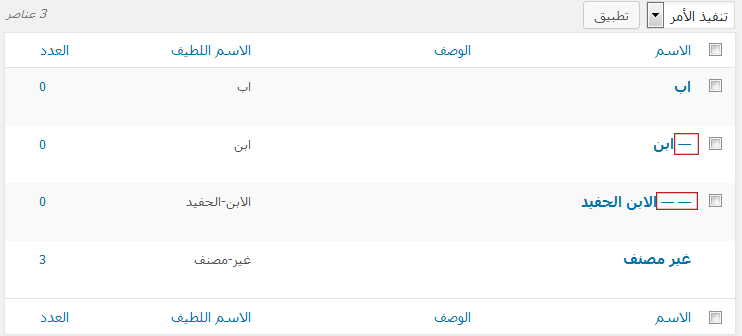 العدد : وهو عدد المقالات داخل التصنيف واذا ضغطت عليه يقوم بتحويلك لصفحة ادارة المقالات Posts screen لادارة المقالات فى هذا التصنيف.