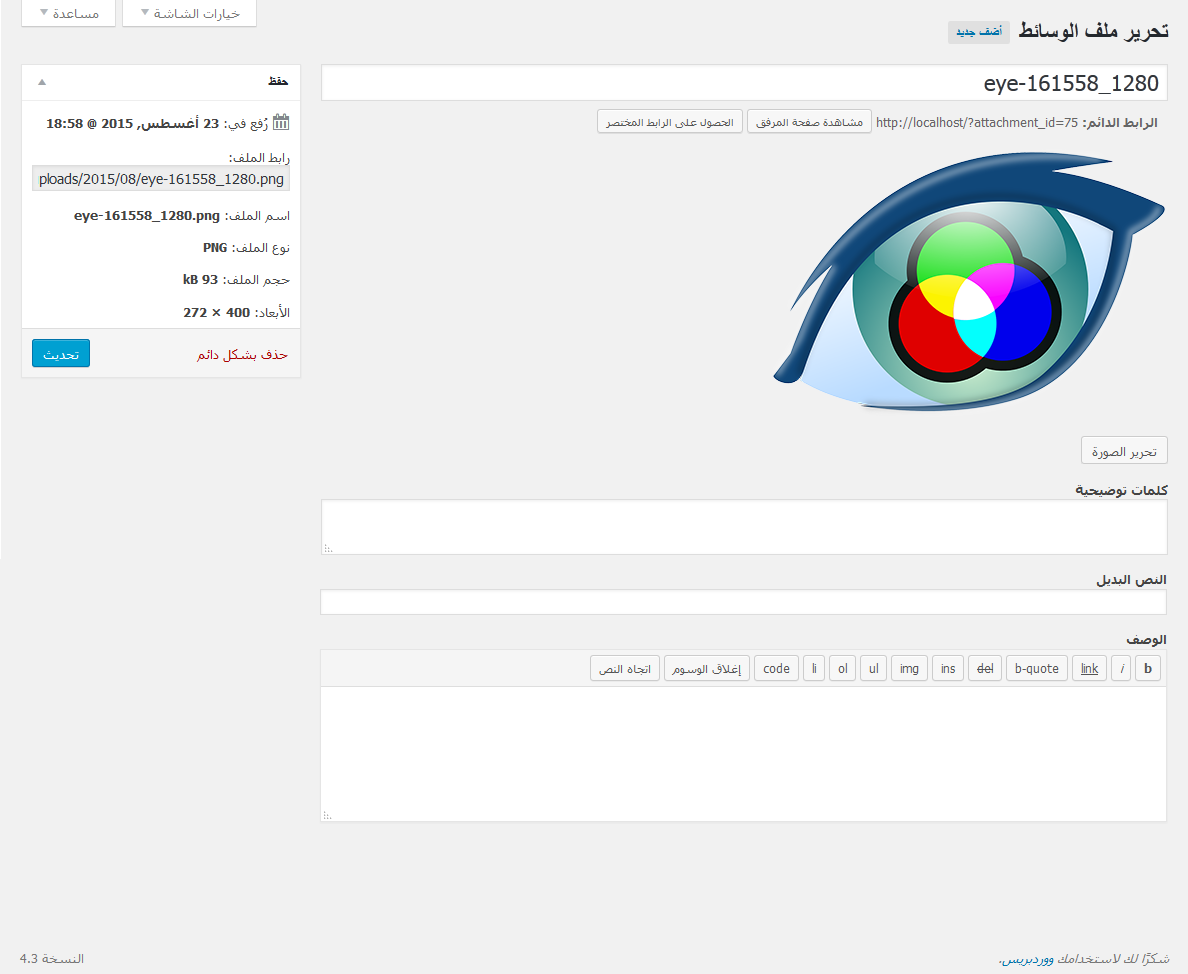 صفحة تحرير الوسائط Edit Media مسؤلة عن تحرير ملفات الوسائط الموجودة داخل مكتبة الوسائط بحيث تتحكم في ابعاد الصور التي يتم رفعها وأيضا الفيديو والصوتيات. يمكن فتح صفحة تحرير الوسائط من خلال الضغط على عنوان ملف الوسائط Media Title فى مكتبة الوسائط Media library أو بالضغط على ملف تحرير Edit من خيارات الأوامر الفورية Immediate Actions اثناء الوقوف بالماوس على العنوان. يمكنك ايضا فتح صفحة تحرير الوسائط Edit Media اثناء اضافة ملف وسائط جديد Add New Media بالضغط على “تحرير” Edit