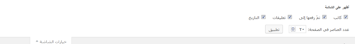 ويمكن التحكم فى عدد الصفحات التى تظهر فى صفحة عرض الصفحات ( WordPress Pages screen ) وايضا اى الجداول يتم عرضها عن طريق خيارات الشاشة Display Options
