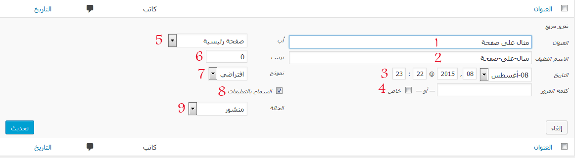 التحرير السريعالتحرير السريع Quick Edit هو اختيار يتيح لك تغيير بعض معلومات الصفحة دون الدخول لصفحة تحرير الصفحة Edit Page