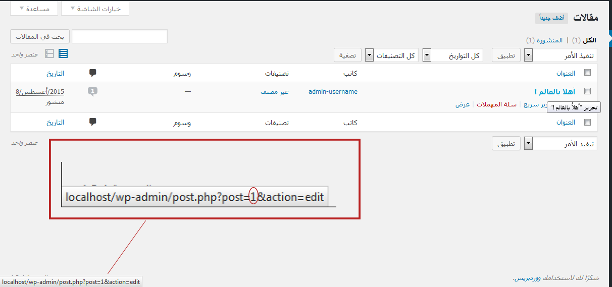 رقم المقال ID : أو Identity وهو لايظهر فى القائمة ولكن يظهر فى شريط الحالة لاى متصفح كمثال Firefox وهو رقم المقال الذي يقوم ووردبريس بتخزينه فى قاعدة البيانات.