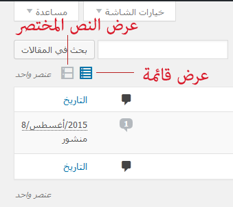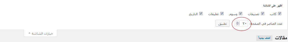 ويمكن التحكم فى عدد المقالات التى تظهر فى صفحة عرض المقالات ( WordPress Posts ) وايضا اى الجداول يتم عرضها عن طريق خيارات الشاشة Display Options