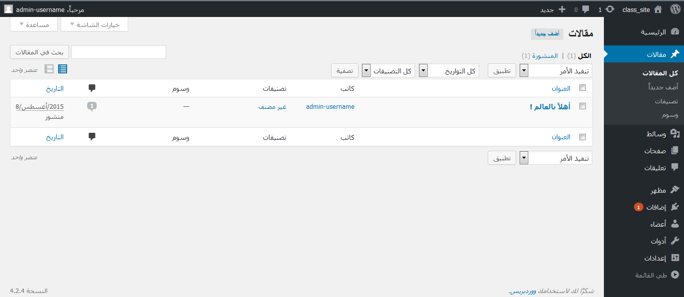 لاحظ قائمة تصفية التصنيفات اعلى الجدول Categories Filter حيث يمكنك تصفية المقالات تبعا للتصنيفات. اى عرض المقالات الخاصة بتصنيف معين.