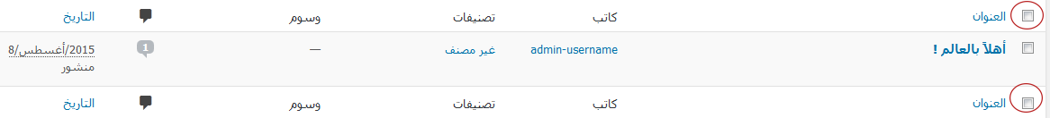مربع تحديد [] : وهو لتحديد المقالة لتطبيق عمليات القائمة تنفيذ الامر Bulk Action.